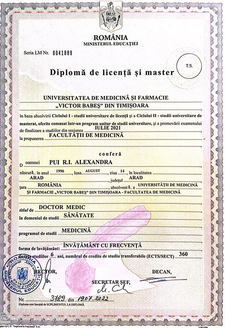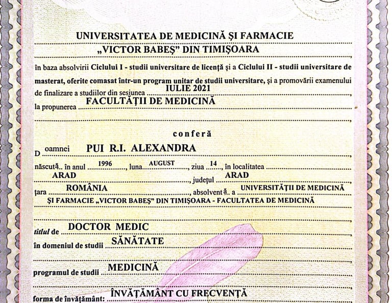 2021: Absolventă a Facultății de Medicină și Farmacie „Victor Babeș” Timișoara